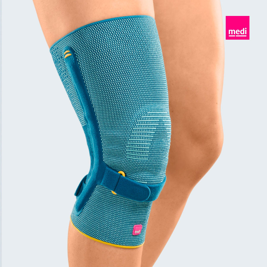 La struttura della ginocchiera è realizzata in un tubolare morbido, elasticizzato e senza lattice (latex-free), con tessuto Medi® che integra sistemi Climafresh e Climacomfort per favorire traspirazione e comfort durante l’uso prolungato. È priva di cuciture e presenta una zona rotulea traforata coperta. All’interno è presente silicone antiscivolo per migliorare la stabilità sulla pelle.