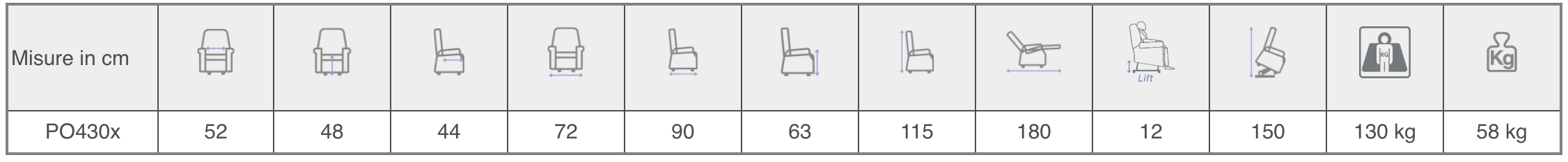 Disponibile nei colori Grigio, Rosa Antico e Tortora. Tra gli accessori opzionali: batteria tampone POA305, tavolino POA306, kit copripoltrona POA409X.