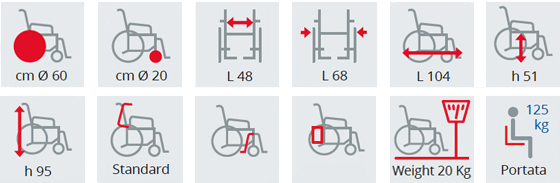 La sedia è facilmente conducibile anche in posizione chiusa e può essere accessoriata con optional come freni allo schienale e appoggiagambe regolabili e girevoli. È presente anche una cintura di sicurezza per una protezione aggiuntiva dell’utente.